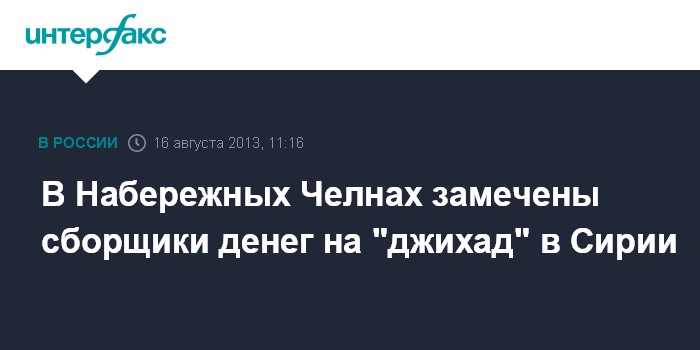 Казань. 16 августа. INTERFAX.RU - В городе Набережные Челны на улицах замечены сборщики пожертвований на "помощь братьям, находящимся на джихаде в Шаме" (в исламской географии так принято называть Сирию).