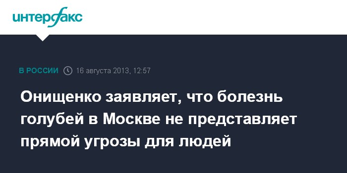 Москва. 16 августа. INTERFAX.RU - Гибель голубей в Москве связана с сальмонеллезом, сообщил глава Роспотребнадзора, главный государственный санитарный врач России Геннадий Онищенко.