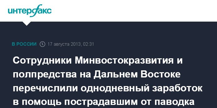 Кроме того, сотрудники министерства и аппарата полпреда приняли решение перечислить дневной заработок в фонд помощи пострадавшим от наводнения жителям Амурской области, Еврейской автономной области и Хабаровского края.
