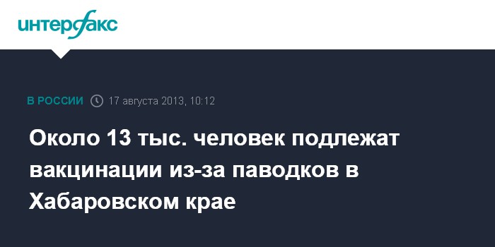 Хабаровск. 17 августа. INTERFAX.RU - В Хабаровском крае из-за паводков подлежат вакцинации около 13 тыс. человек, сообщил журналистам руководитель Управления Роспотребнадзора по Хабаровскому краю Владимир Отт.