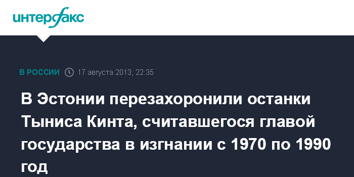 "Тынис Кинт был премьер-министром в изгнании, который дольше всех исполнял обязанности президента и оставался единственным неперезахороненным в Эстонии главой государства, место захоронения которого было известно", - сообщили "Интерфаксу" в госканцелярии Эстонии.