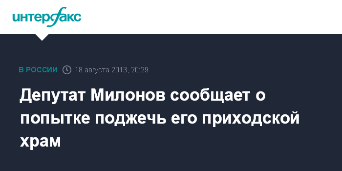 Москва. 18 августа. INTERFAX.RU - Депутат петербургского законодательного собрания Виталий Милонов заявил, что неизвестные попытались поджечь храм, председателем попечительского совета которого он является.