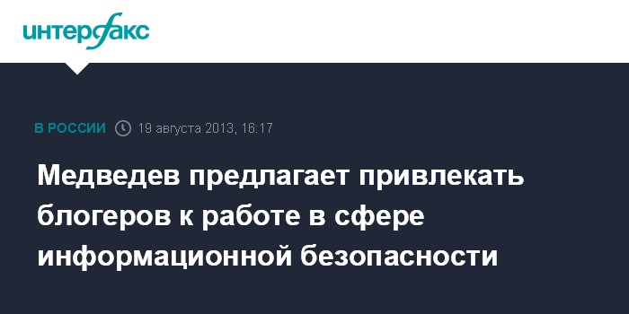 Пятигорск. 19 августа. INTERFAX.RU - Премьер РФ Дмитрий Медведев считает, что к разработкам в сфере информационной безопасности должны привлекаться люди, постоянно присутствующие в этой сфере, в том числе блогеры.
