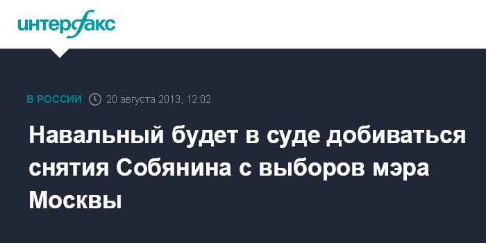 Москва. 20 августа. INERFAX.RU - Оппозиционер Алексей Навальный во вторник подает жалобу в Мосгорсуд из-за отказа предоставить Сергеем Собяниным письменного согласия президента РФ на регистрацию кандидатом в мэры Москвы.