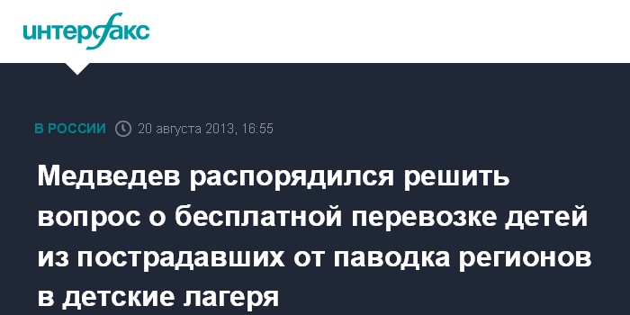 На совещании во вторник в Горках премьер распорядился решить вопрос о бесплатной перевозке детей в эти лагеря. "Нужно этот вопрос закрыть полностью, организовать бесплатную перевозку и бесплатные билеты", - сказал Медведев.