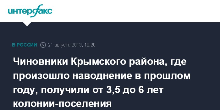 Крымск. 21 августа. INTERFAX.RU - Суд в Крымске (Краснодарский край) вынес в среду приговор бывшим чиновникам по делу о разрушительном наводнении летом прошлого года, унесшем жизни более 100 человек.