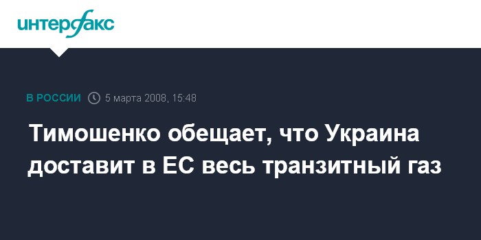 Киев. 5 марта. INTERFAX.RU - Украина доставит в Европу весь газ, поставляемый из России, заверила премьер-министр Юлия Тимошенко.