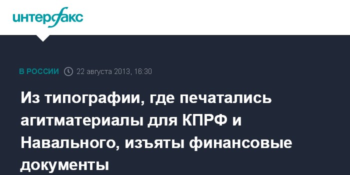 Москва. 22 августа. INTERFAX.RU - Полиция изъяла часть финансовой документации в столичной типографии, где печатались агитационные материалы, в том числе для КПРФ и кандидата в мэры Москвы от оппозиции Алексея Навального.