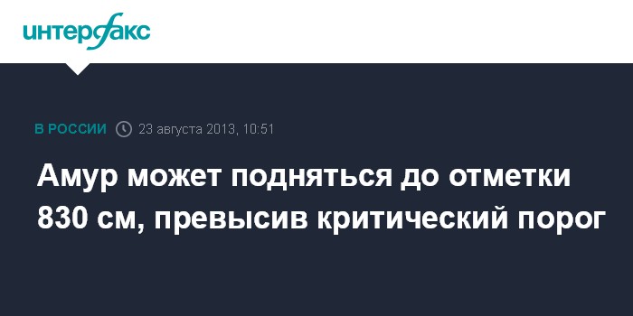 Москва. 23 августа. INTERFAX.RU - Уровень реки Амур, по прогнозам синоптиков, к началу сентября достигнет отметки в 830 см.