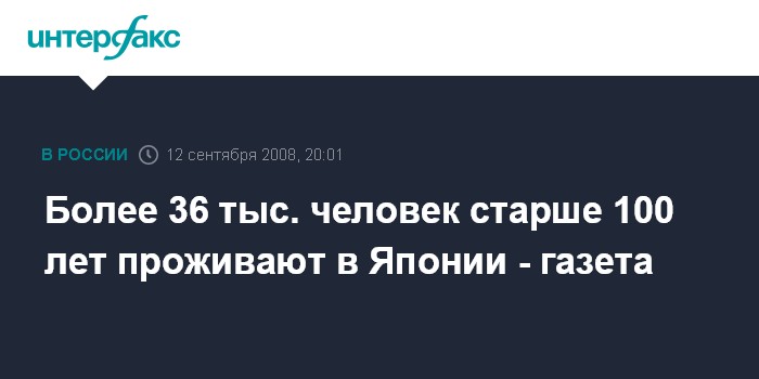 Лондон. 12 сентября. ИНТЕРФАКС - Более 36 тыс. человек, старше 100 лет проживают в настоящее время в Японии, что является рекордом для этой страны, сообщает в пятницу британская газета "Гардиан".