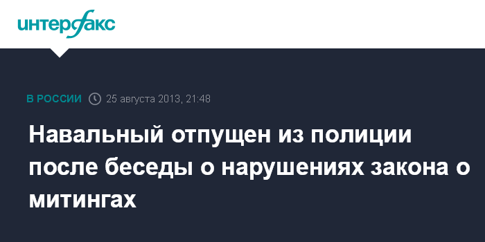 Москва. 25 августа. INTERFAX.RU - Кандидата в мэры Москвы, оппозиционера Алексея Навального приглашали в полицию для беседы и уже отпустили, заявили "Интерфаксу" в пресс-службе ГУ МВД по столице.
