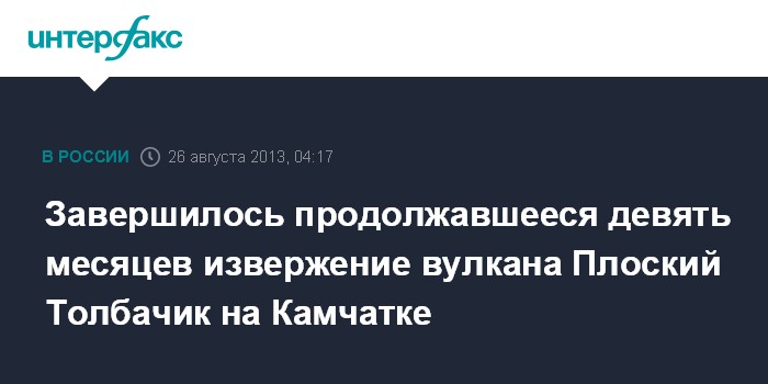 Петропавловск-Камчатский. 26 августа. ИНТЕРФАКС-ДАЛЬНИЙ ВОСТОК - Завершилась активная фаза извержения вулкана Плоской Толбачик на Камчатке, сообщал агентству "Интерфакс - Дальний Восток" в понедельник заведующий лабораторией Камчатского филиала Геофизической службы РАН Сергей Сенюков.