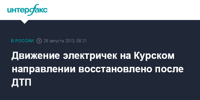 Москва. 26 августа. INTERFAX.RU - Движение пригородных поездов Курского направления Московской железной дороги, прерванное рано утром в понедельник из-за ДТП на 34-м километре, восстановлено, сообщил "Интерфаксу" источник в транспортном комплексе столицы.