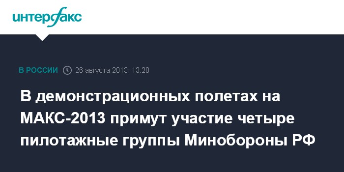 Москва. 27 августа. INTERFAX.RU - Четыре пилотажных группы ВВС России примут участие в демонстрационных полетах на авиационно-космическом салоне МАКС-2013, который пройдет с 27 августа по 1 сентября в подмосковном Жуковском, сообщили "Интерфаксу-АВН" в понедельник в пресс-службе военного ведомства.