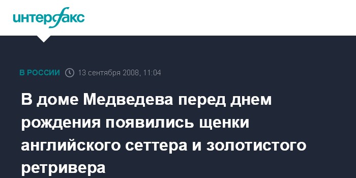 В интервью газете "Комсомольская правда", опубликованном в субботу, Медведев сообщил, что день рожденья уже принес ему сюрпризы. "У нас дома появились щенки - у меня английский сеттер, а у сына - золотистый ретривер. Так что семья стала больше", - сказал он.