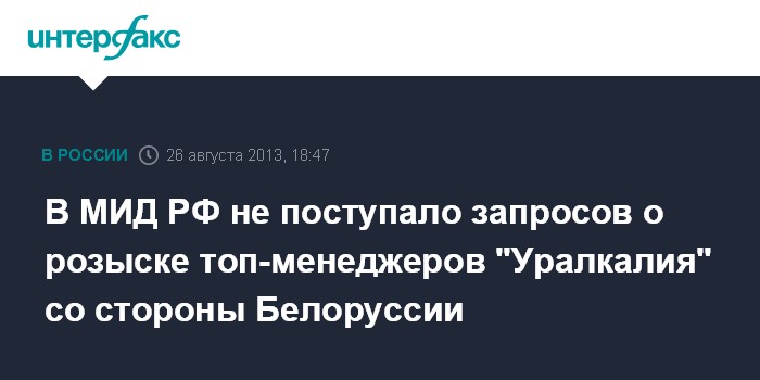 Москва. 26 августа. INTERFAX.RU - В МВД России не поступало никаких запросов от белорусской стороны относительно розыска и задержания топ-менеджеров "Уралкалия", сообщили "Интерфаксу" в пресс-центре МВД РФ.