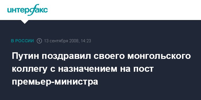 Москва. 13 сентября. INTERFAX.RU - Председатель правительства России Владимир Путин направил поздравительную телеграмму Санжийну Баяру в связи с его назначением на пост премьер-министра Монголии, сообщили в пресс-службе правительства РФ в субботу.