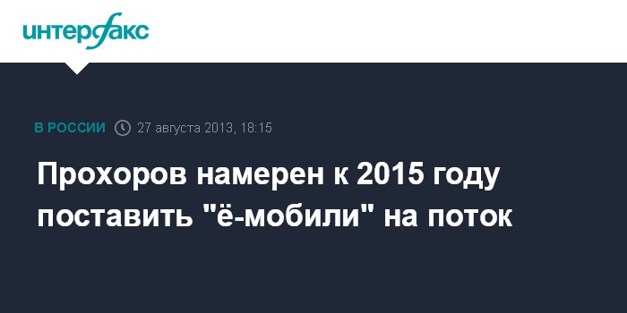 Ростов-на-Дону. 27 августа. INTERFAX.RU - Серийный выпуск "ё-мобилей" под Санкт-Петербургом начнется в начале 2015 г., сообщил бизнесмен Михаил Прохоров на пресс-конференции во вторник в пресс-центре агентства "Интерфакс" в Ростове-на-Дону.