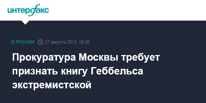 Москва. 27 августа. INTERFAX.RU - Прокуратура Москвы потребовала через суд признать экстремистским материалом изданную недавно в России книгу одного из руководителей нацистской Германии Йозефа Геббельса.