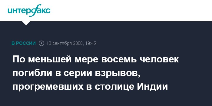 Лондон. 13 сентября. ИНТЕРФАКС - Не менее восьми человек погибли и более 80 получили ранения в результате серии взрывов в Дели, сообщает британская телерадиокорпорация Би-Би-Си.
