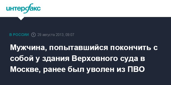 Москва. 29 августа. INTERFAX.RU - Мужчина, попытавшийся сжечь себя накануне у здания Верховного суда в Москве, служил в части ПВО Минобороны, сообщил "Интерфаксу" источник в правоохранительных органах.
