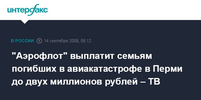 Москва. 14 сентября. ИНТЕРФАКС - Семьи погибших в авиакатастрофе самолета Боинг-737 в Перми получат от "Аэрофлота" до двух миллионов рублей, сообщает телеканал "Вести-24".