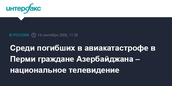 Баку. 14 сентября. INTERFAX.RU - Среди 88 человек, погибших в результате крушения самолета "Боинг-737" в черте города Перми, были девять азербайджанцев, в том числе одна женщина, передает азербайджанский телеканал ANS.