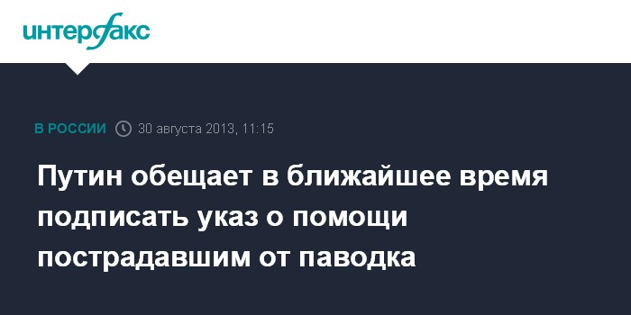 Биробиджан. 30 августа. INTERFAX.RU - Президент России Владимир Путин в пятницу заявил, что в самое ближайшее время подпишет указ об оказании материальной помощи пострадавшим от наводнения жителям Дальнего Востока.