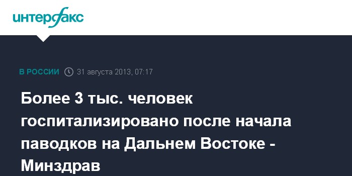 Владивосток. 31 августа. ИНТЕРФАКС - В настоящее время в Дальневосточном регионе госпитализированы порядка 3 тыс. человек, косвенно или прямо пострадавших в результате небывалого паводка, заявила министр здравоохранения Вероника Скворцова.