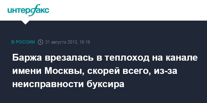 Москва. 31 августа. INTERFAX.RU - Причиной столкновения двух судов на канале имени Москвы, по предварительным данным, явилась неисправность рулевого управления буксира, сообщили в пресс-службе Управления на транспорте МВД по ЦФО. "Баржу вел "толкач", у которого, по предварительным данным, вышло из строя рулевое управление", - сказал сотрудник пресс-службы в субботу "Интерфаксу".