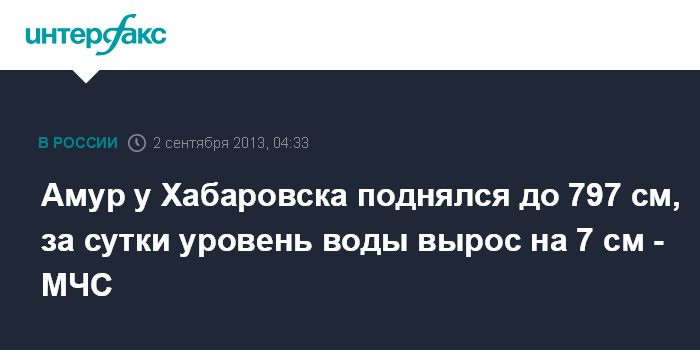 По данным на 08:00 по местному времени (01:00 мск) понедельника, уровень составил 797 см, сообщила пресс-служба ГУ МЧС по Хабаровскому краю.