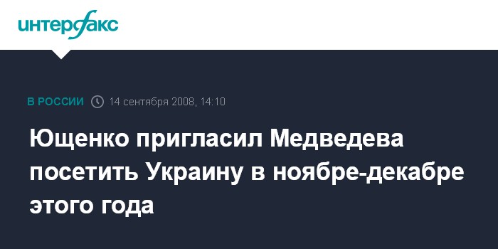 Киев. 14 сентября. INTERFAX.RU - Президент Украины Виктор Ющенко в телефонном разговоре в воскресенье пригласил президента России Дмитрия Медведева посетить с визитом Украину в ноябре-декабре 2008 года.