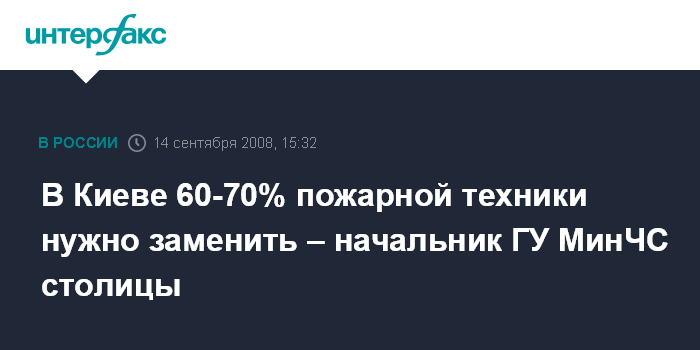 Киев. 14 сентября. INTERFAX.RU - 60-70% пожарной техники Киевского гарнизона пожарно-спасательной службы требует замены.