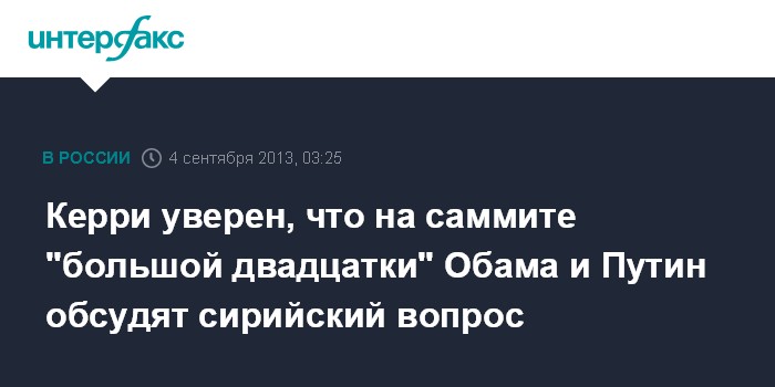 Вашингтон. 4 сентября. ИНТЕРФАКС - Президенты США и России в рамках саммита G-20 в Санкт-Петербурге будут иметь возможность обсудить сирийский вопрос, заявил госсекретарь США Джон Керри.