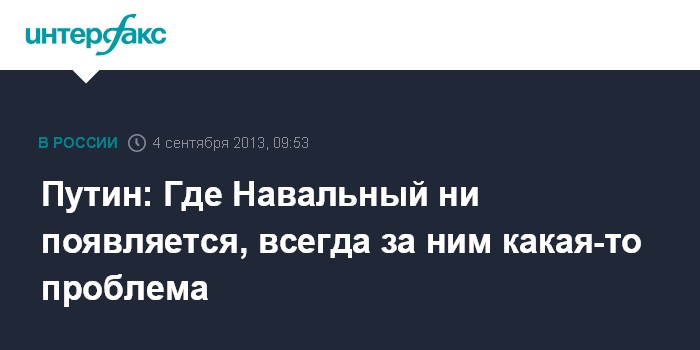 Москва. 4 сентября. INTERFAX.RU - Президент РФ Владимир Путин считает, что деятельность оппозиционера Алексея Навального сопровождается неприятностями с правоохранительными органами. "Где этот господин ни появляется, там всегда он что-то следит, как у нас говорят, всегда за ним какая-то проблема: то спирт, говорят, или спиртовой завод там утащил, то с лесом какие-то проблемы, то у него обнаружились фирмы за границей, он их не задекларировал. Это очевидный факт", - заявил Путин в интервью российскому Первому каналу и агентству Associated Press.