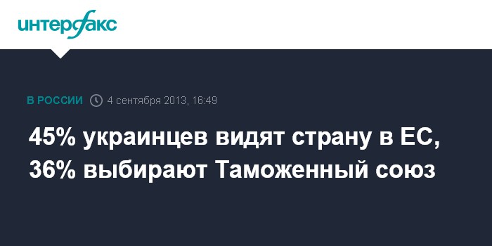 Киев. 4 сентября. INTERFAX.RU - Отвечая на вопрос "Какое интеграционное объединение Вы выбрали бы, если бы была необходимость сделать однозначный выбор?", 45% опрошенных отметили, что это был бы Европейский Союз, 36% - Таможенный союз.