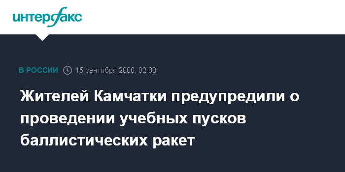 Петропавловск-Камчатский. 15 сентября. ИНТЕРФАКС-ДАЛЬНИЙ ВОСТОК - Командование Войск и Сил на Северо-Востоке России уведомило руководство Камчатского края о том, что согласно плану боевой подготовки Тихоокеанского Флота на 2008 год в период с 15 по 20 сентября над северной частью полуострова планируется проведение пусков баллистических ракет.