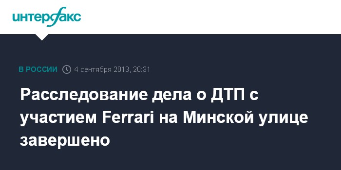 Москва. 4 сентября. INTERFAX.RU - Закончено расследование уголовного дела о ДТП с участием автомобиля "Феррари", водитель которого насмерть сбил мужчину на западе столицы, сообщили "Интерфаксу" в пресс-службе ГУ МВД России по Москве.