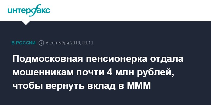 В ходе проверки было установлено, что в середине августа с 64-летней потерпевшей связались некие люди, сообщившие о том, что она может вернуть с процентами вклад, сделанный в пирамиду "МММ" в 90-х годах прошлого века.