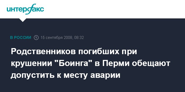 Пермь. 15 сентября. INTERFAX.RU - Родственники погибших авиакатастрофе в Перми будут допущены к месту аварии в ближайшее время, сообщил начальник Приволжско-Уральского регионального центра МЧС РФ Валерий Власов.