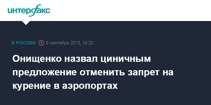 Москва. 5 сентября. INTERFAX.RU - Глава Роспотребнадзора, главный государственный санитарный врач РФ Геннадий Онищенко раскритиковал предложение экспертов Минфина разрешить курение в аэропортах.