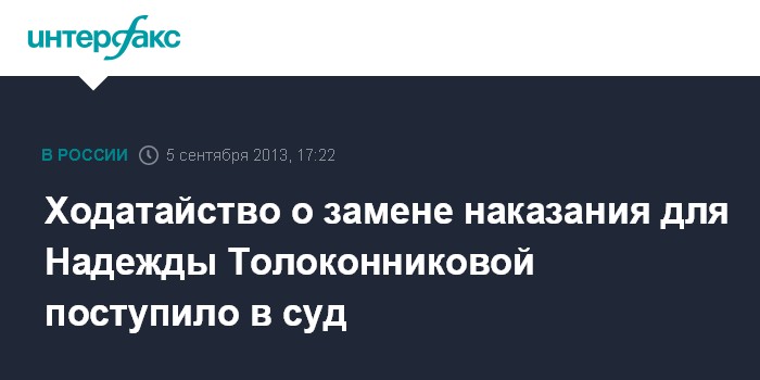 Саранск. 5 сентября. INTERFAX.RU - В Зубово-Полянский районный суд Мордовии поступило ходатайство защиты о замене наказания участнице группы Pussy Riot Надежде Толоконниковой.