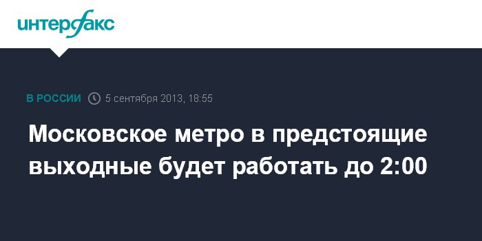 Москва. 5 сентября. INTERFAX.RU - В ночь с 7 на 8 сентября и с 8 на 9 сентября (в ночь после выборов мэра Москвы) Московский метрополитен будет работать на час дольше обычного, сообщили "Интерфаксу" в пресс-службе метро в четверг.