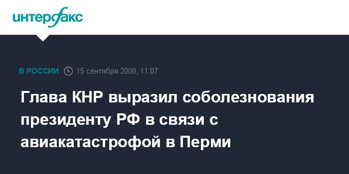 Пекин. 15 сентября. INTERFAX.RU - Председатель КНР Ху Цзиньтао направил президенту России Дмитрию Медведеву телеграмму с соболезнованиями в связи с катастрофой российского самолета в Перми, в которой погибло 88 человек, сообщают китайские СМИ.