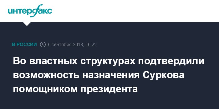 Москва. 6 сентября. INTERFAX.RU - Во властных структурах "Интерфаксу" подтвердили возможность назначения в ближайшее время Владислава Суркова в президентскую администрацию на должность помощника.