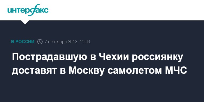 Москва. 7 сентября. INTERFAX.RU - МЧС России направило самолет в Чехию за 25-летней россиянкой, получившей тяжелые травмы.