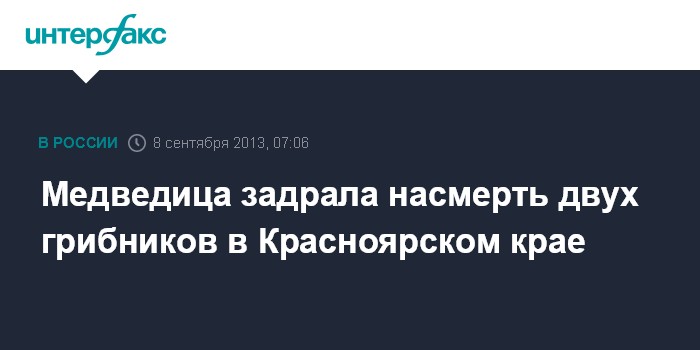 Красноярск. 8 сентября. ИНТЕРФАКС-СИБИРЬ - Полицейские застрелили медведицу, которая убила двух грибников под Ачинском в Красноярском крае, сообщил агентству "Интерфакс-Сибирь" замначальника ГУ МВД России по региону Владимир Юрченко.