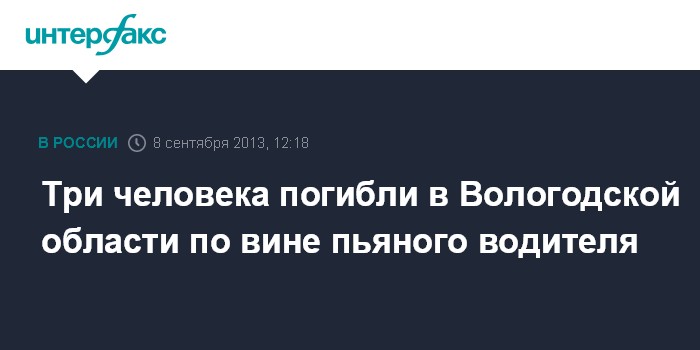 Вологда. 8 сентября. INTERFAX.RU - Три человека погибли в ДТП в Вологодской области по вине пьяного водителя, "Интерфаксу" в воскресенье сообщили в региональном управлении МВД.
