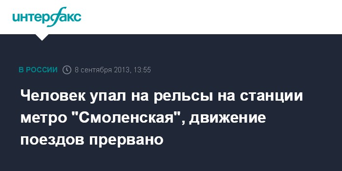 Москва. 8 сентября. INTERFAX.RU - Мужчина упал на пути на станции метро "Смоленская" Арбатско-Покровской линии Московского метрополитена, возможны задержки в движении поездов, сообщили "Интерфаксу" в пресс-службе ГУ МВД России по Москве.