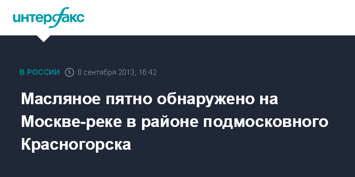 Москва. 8 сентября. INTERFAX.RU - Подмосковные спасатели обнаружили на Москве-реке в районе Красногорска масляное пятно, сообщили "Интерфаксу" в региональном управлении МЧС.